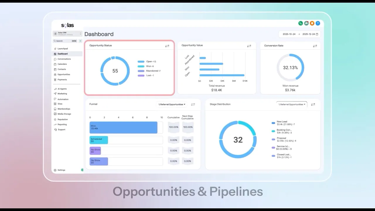 Track every lead, client, task, and invoice — with real-time pipeline, calendar, and revenue dashboards at a glance.