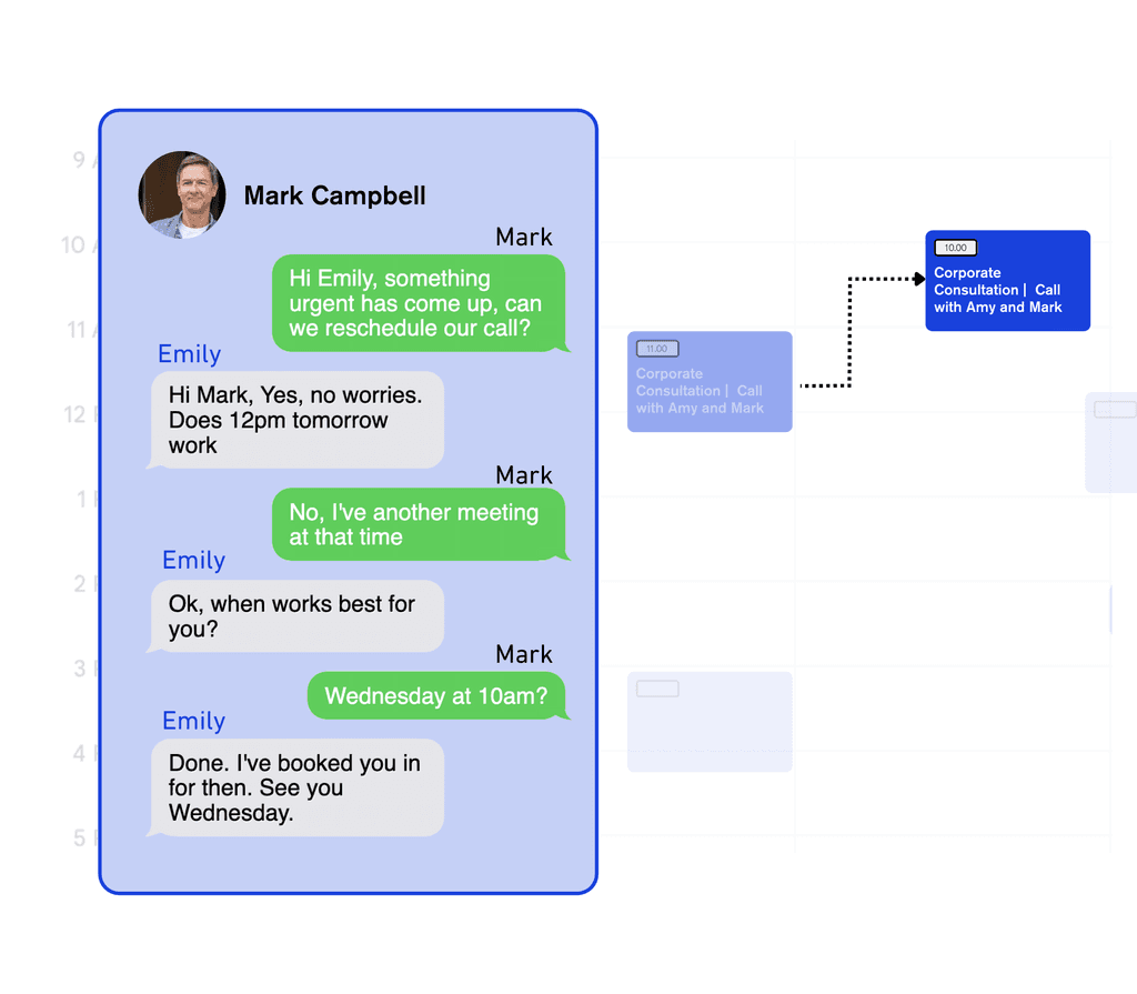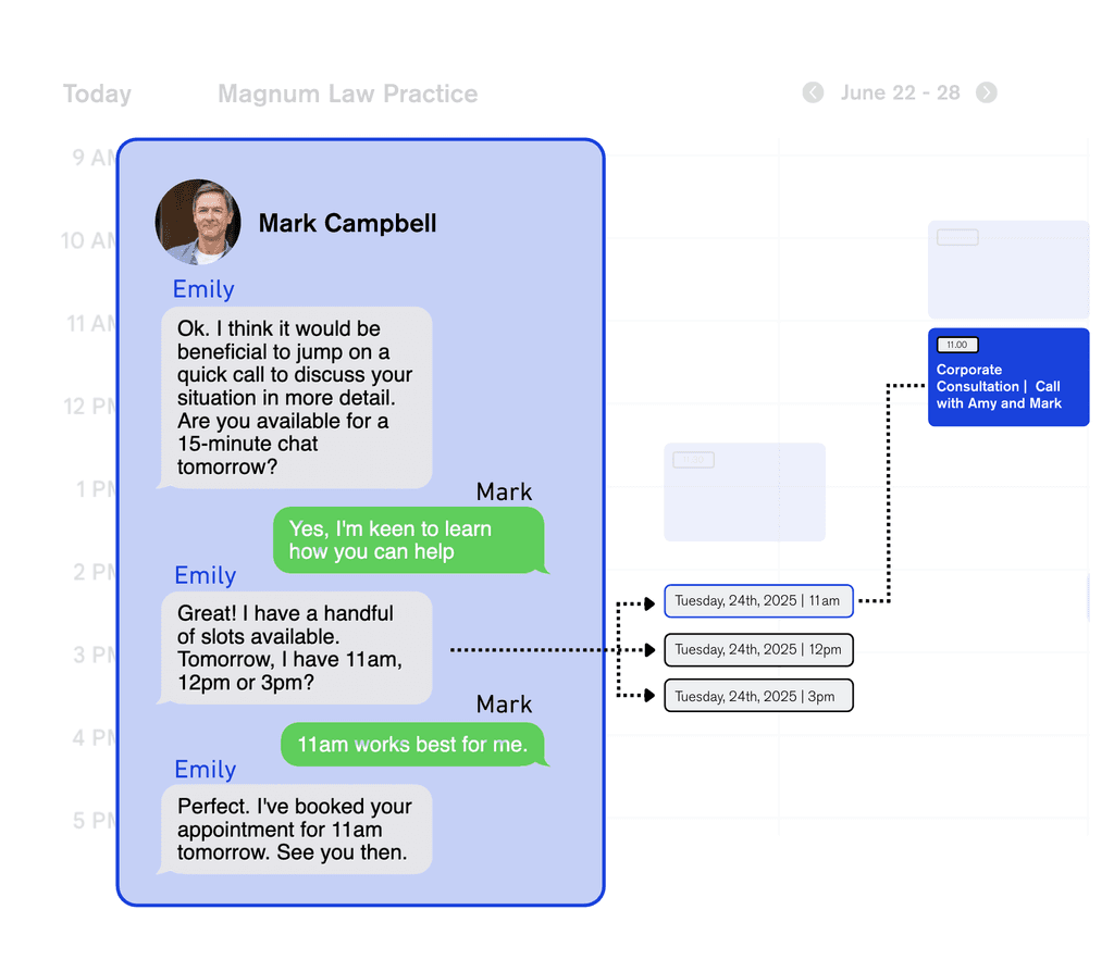 Emily handles the full booking flow over SMS — no forms, no links, no ghosting. She checks your availability, suggests a time, and locks it in — like a real assistant.