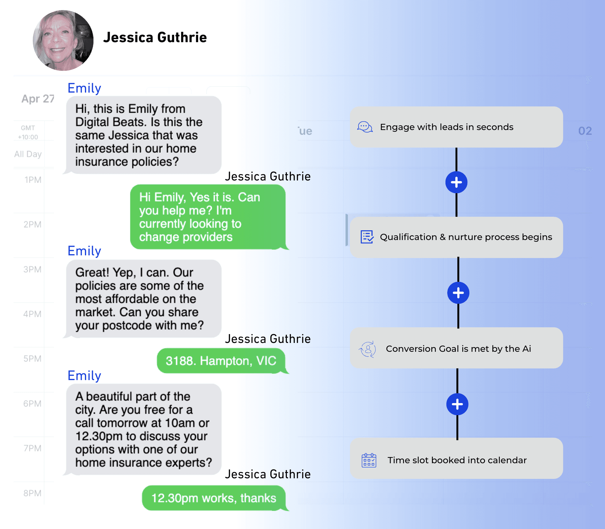 Emily replies via SMS the moment a lead comes in. She qualifies them with smart sales questions and books them straight into your calendar — before your competitors even reply.
